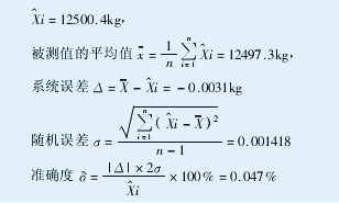 數(shù)據(jù)統(tǒng)計(jì)誤差通常分隨機(jī)誤差和系統(tǒng)誤差。隨機(jī)誤差是在實(shí)際測(cè)量條件下多次測(cè)量同一量值時(shí),誤差的絕對(duì)值和符號(hào)以不同方式變化著的誤差。它反映了被測(cè)檢驗(yàn)裝置的精度,隨機(jī)誤差越小,說(shuō)明其精度越高。系統(tǒng)誤差是在偏離規(guī)定的測(cè)量條件下多次測(cè)量同一量值時(shí),誤差的絕對(duì)值和符號(hào)保持恒定的誤差。系統(tǒng)誤差反映了被測(cè)檢驗(yàn)裝置的正確度,系統(tǒng)誤差越小,說(shuō)明其正確度越高。評(píng)價(jià)檢驗(yàn)裝置的精度既不能單獨(dú)看其隨機(jī)誤差,也不能單獨(dú)考查其系統(tǒng)誤差,而是要對(duì)其進(jìn)行綜合分析和計(jì)算,從而確定被測(cè)檢驗(yàn)裝置的綜合指標(biāo),即準(zhǔn)確度(此時(shí)不討論誤差分配問(wèn)題)。2003年8月23日在現(xiàn)場(chǎng)測(cè)試循環(huán)鏈碼稱(chēng)量數(shù)據(jù)10次:12496  12497  12498  12495  12499  12496  12497 12499 12497 12499,通過(guò)對(duì)循環(huán)鏈碼總重量計(jì)算值為